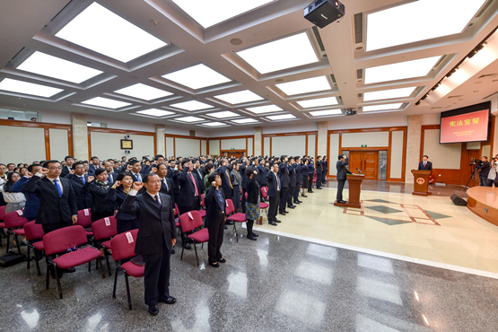 会议举行了宪法宣誓仪式。上午9点半,在李利的监誓下,焦红宣布宣誓仪式开始。国家药监局局机关干部集体列队,面向国徽、国旗,同唱中华人民共和国国歌。领誓人抚按宪法,宣读誓言,其他宣誓人列队站立,跟诵誓词。
