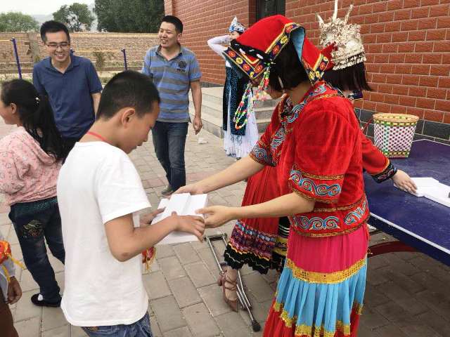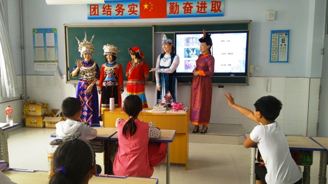 6月5日,揣骨疃中心学校,四个学员小组充分发挥各自专业优势,给四个班的孩子们上了生动一课。第一组以“56个民族介绍”为主题,由5名学员身着华彩的民族服装,通过知民族、识民族、猜民族等环节,为小朋友展开民族知识的画卷,他们还准备了民族运动——竹篓接绣球的体验活动。第二组的授课内容是介绍国家博物馆、中国历史以及国旗由来,孩子们接受了一次生动的爱国主义教育,课堂最后,学员们与小朋友们一起合唱《歌唱祖国》,孩子们的歌声感染了在场的每一名学员。第三组以“一带一路”为主题,给孩子们讲解沿途的历史典故和风土人情,领略古老和现代文明的激烈融合。第四组为孩子们进行了一堂水利知识科普课,重点介绍了我国水情知识概况、重要江河湖泊以及著名水利工程,信息量丰富。