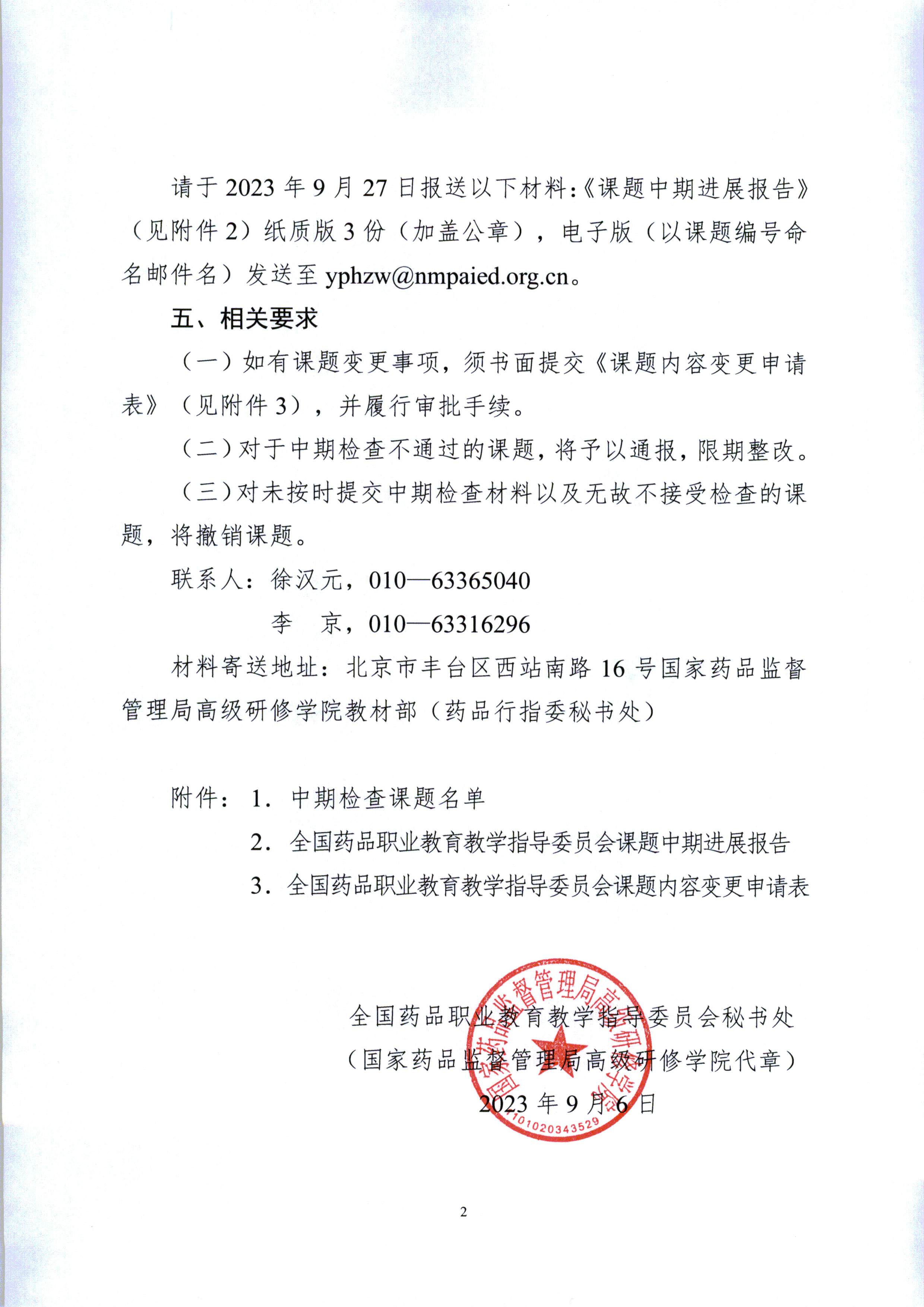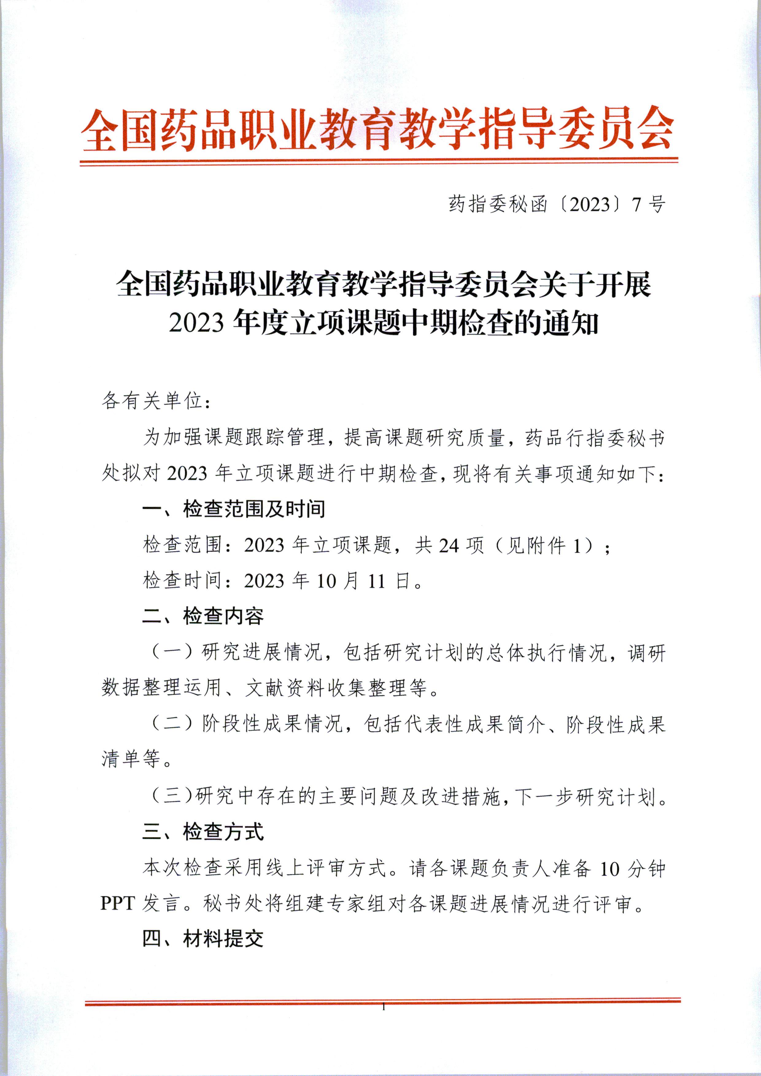 全国药品职业教育教学指导委员会关于开展2023年度立项课题中期检查的通知